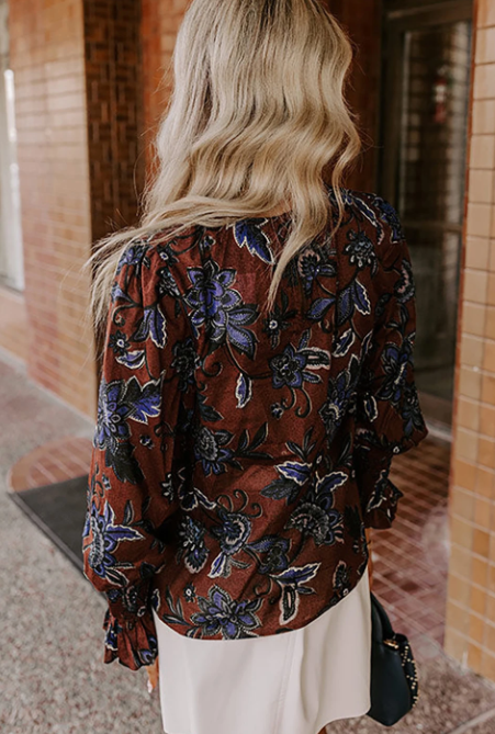 Brown Autumn Floral Print Smocked Cuffs Blouse