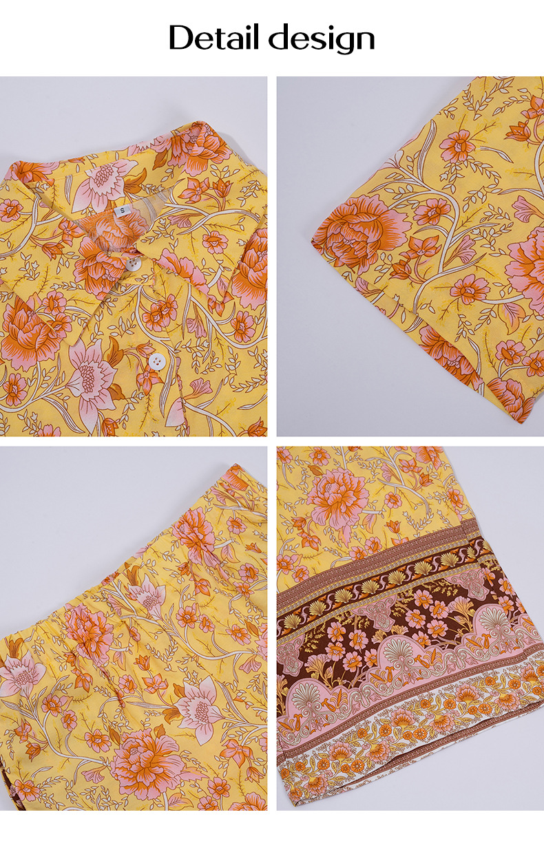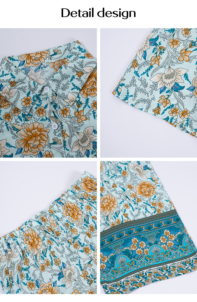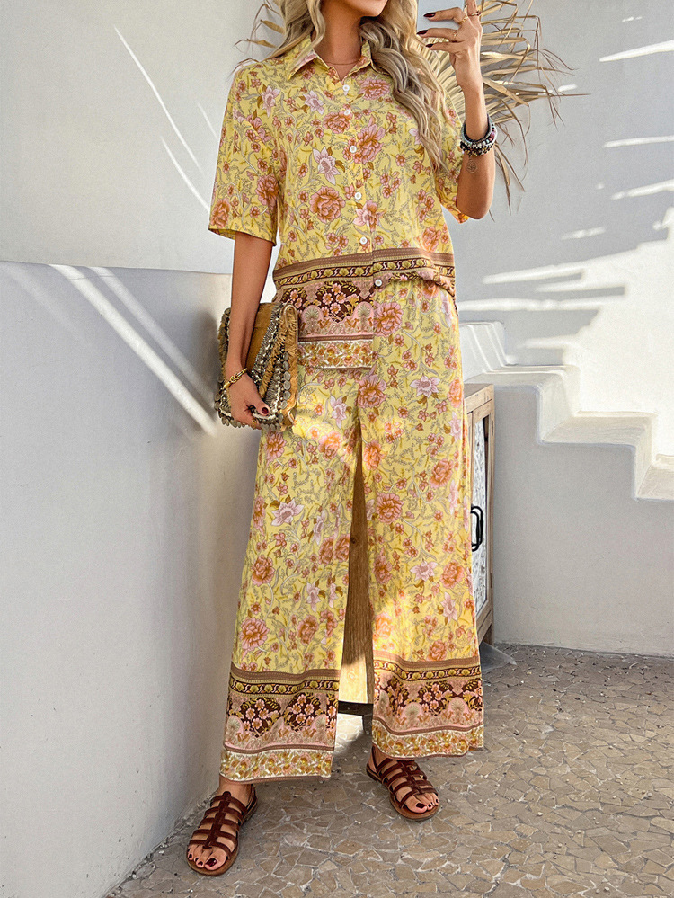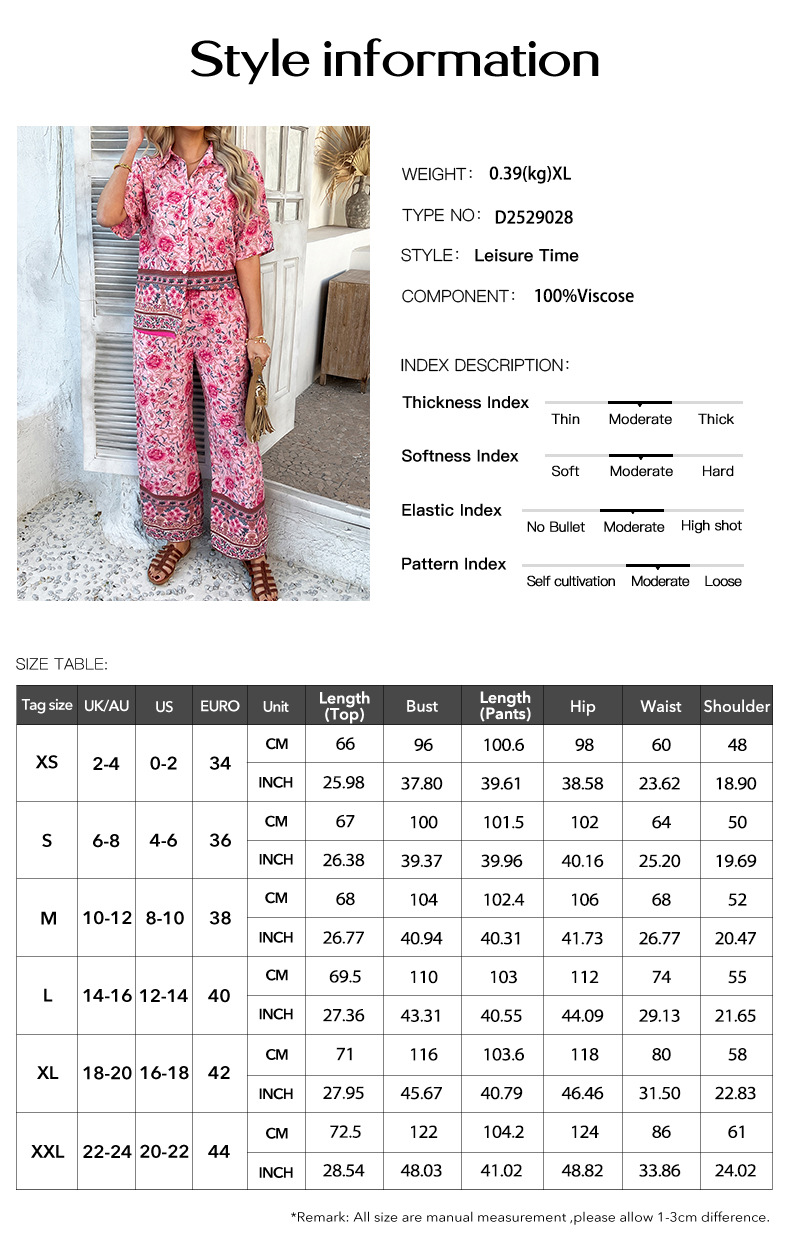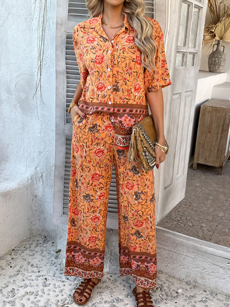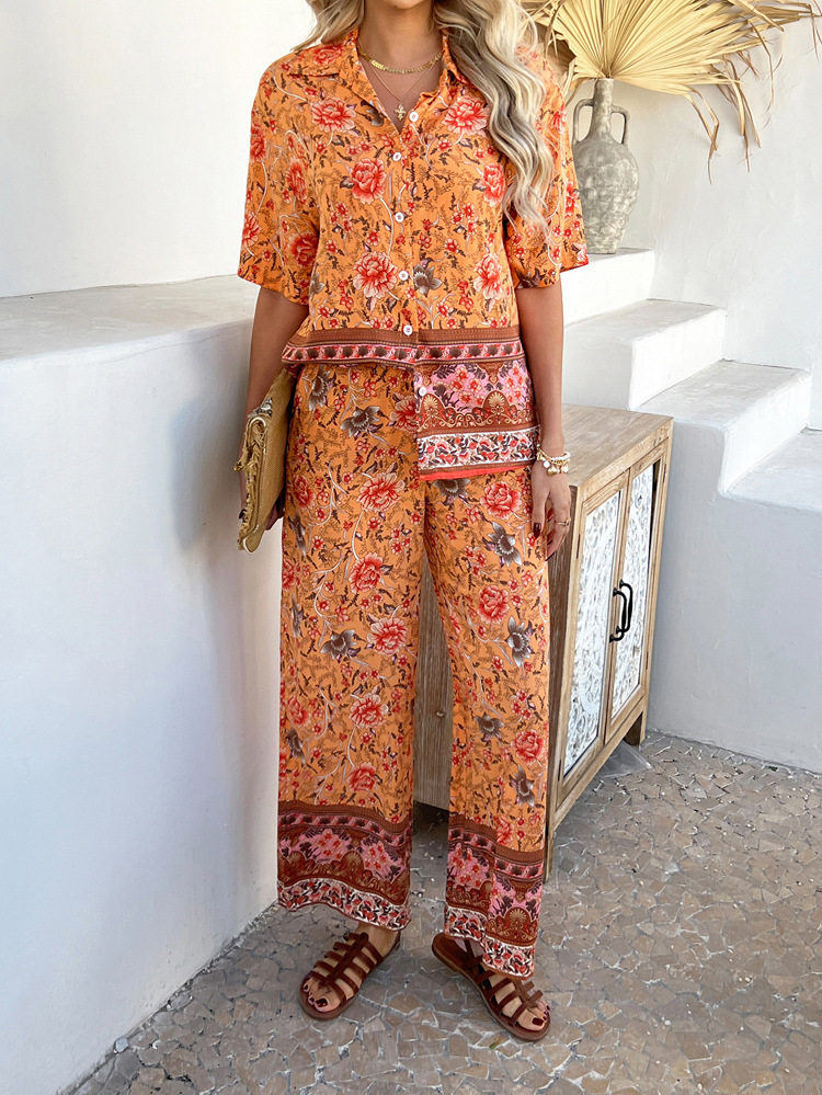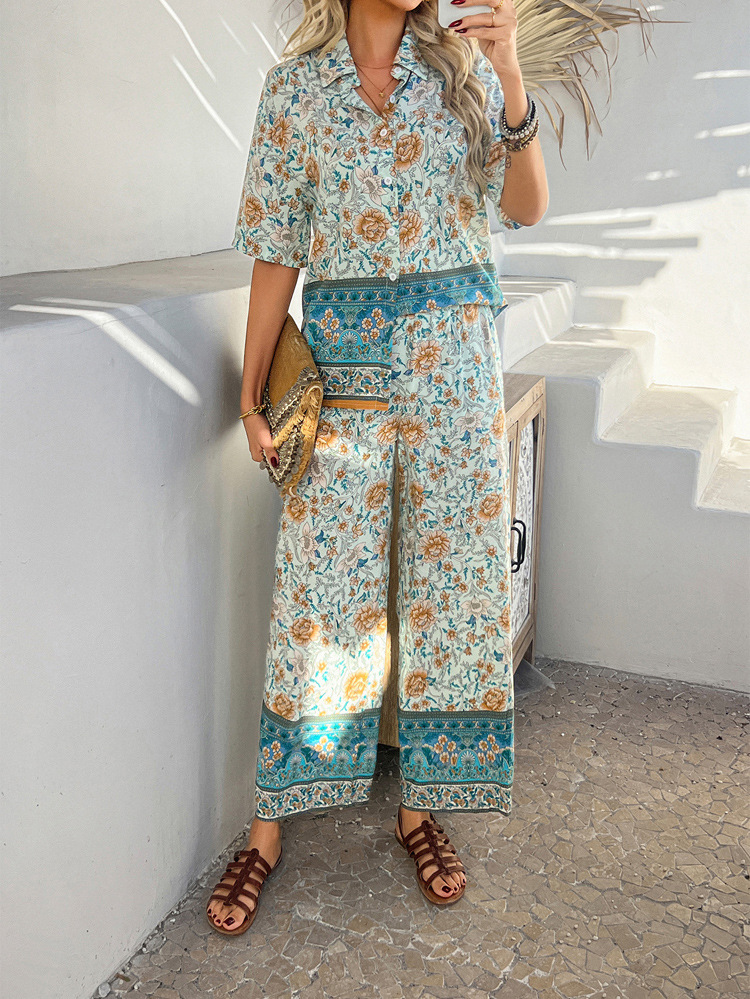 Contrast Color Bohemian Vacation Style Short Sleeve Long Pants
